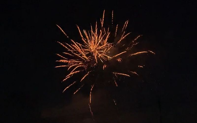 Batteriet skifter nu til en V-formation, der sender bombardementer af triple-skud mod himlen på samme tid. Den ene side eksploderer guldbrokader med hvide blinkere, og den anden side også i guld med røde blinkere.
